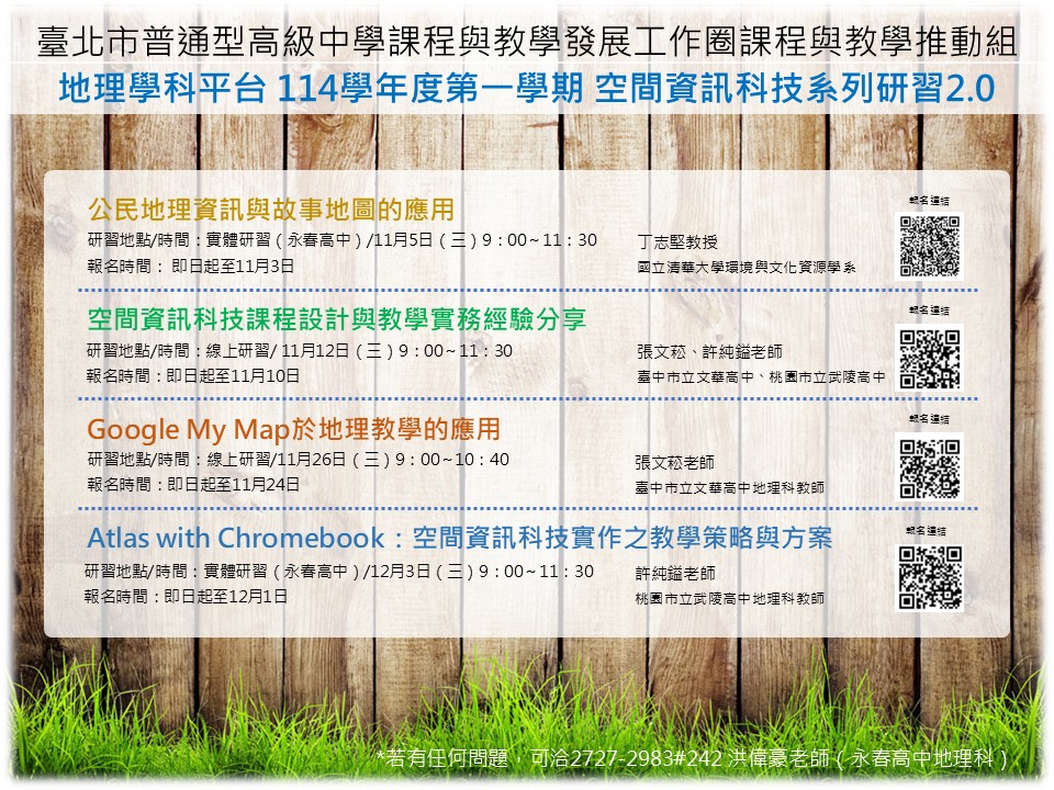 地理學科平台本學期的系列研習活動來囉!108課綱施行之初,平台曾針對「空間資訊科技」辦理增能系列研習,希望能協助教師理解課綱理念、課程設計,並掌握相關工具與應用,使教師對新內容能「不害怕」。本學期,我們將進一步辦理「空間資訊科技增能系列研習2.0」,協助教師能夠與時俱進的持續精進專業。研習邀請空間資訊科技領域專長的丁志堅教授,以及任教於文華高中的張文菘老師、武陵高中的許純鎰老師,分享空間資訊科技的發展趨勢與教學策略,以及課程設計與相關系統或平台的操作經驗。期望透過這次系列研習,讓參與的教師不僅「不害怕」空間資訊科技,還能「有自信」的將其融入於教學中。