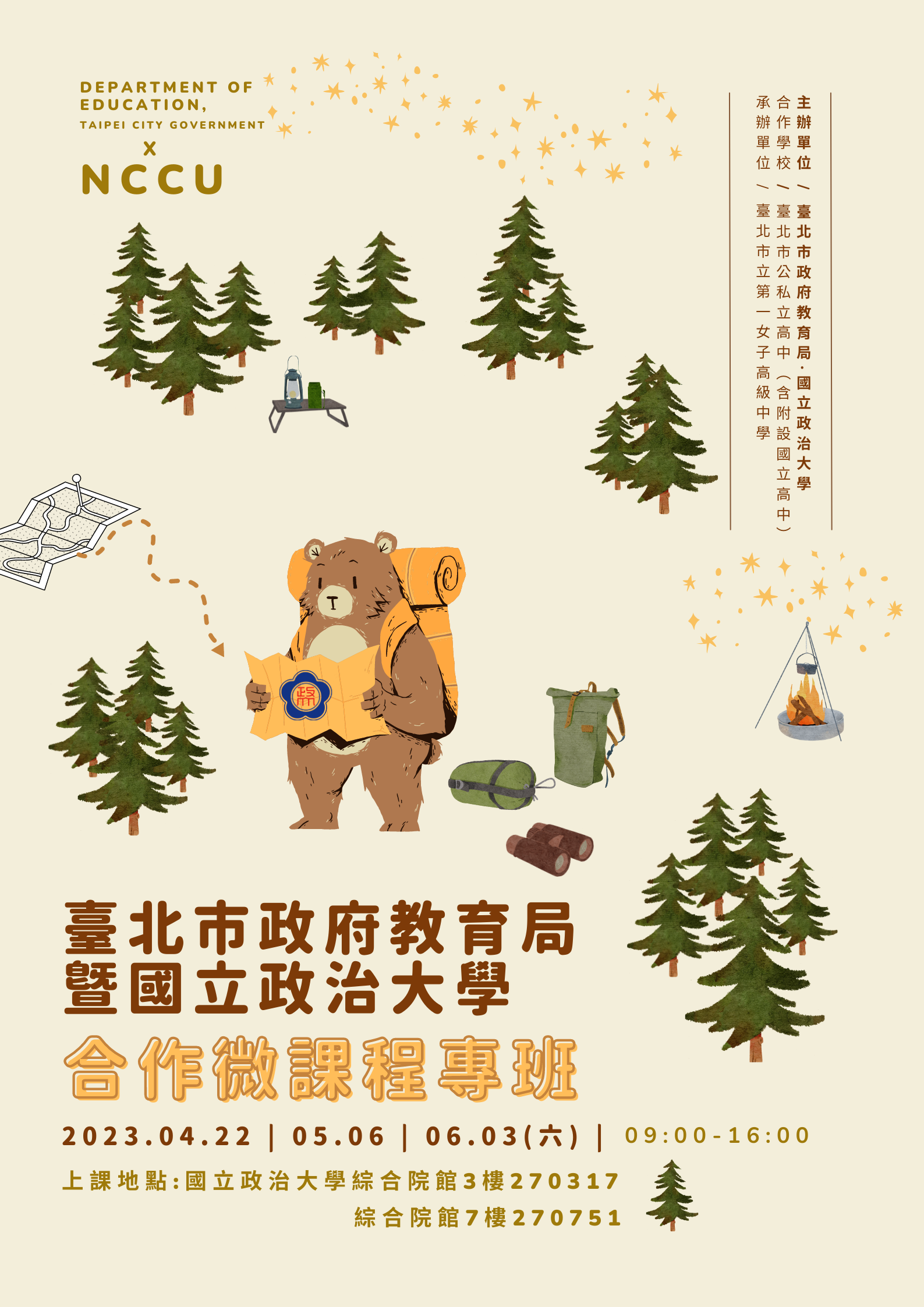 本市教育局與國立政治大學合作,期以實體微課程專班的形式,協助本市高中學生探索大學多元校系及進路發展,作為高中階段興趣探尋與志向規劃之指引。